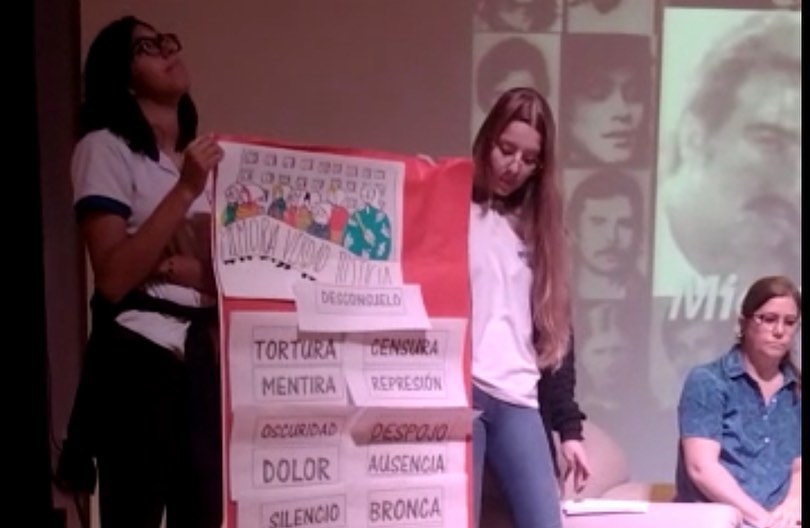 Las profesoras Anabella Paulizi, Mariana Badagnani y el periodista Luis Matías González, invitados por el Municipio local, charlaron con alumnos y alumnas sobre el oscuro período de la historia argentina, realizaron actividades y analizaron la película «Argentina 1985» que los estudiantes habían visto la semana pasada.